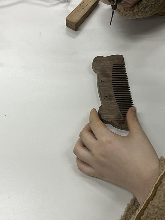 活動邀請了社區(qū)好老師錢娜進(jìn)行講解授課,錢老師為大家展示了宋代半月梳,并講解檀木手作梳背后的傳統(tǒng)文化、歷史故事以及制作工藝。檀木梳子的制作包括選料、打磨、烙花、刻字、拋光等一系列過程。不少學(xué)員都通過手機(jī)搜索圖片,在木梳上臨摹宋代經(jīng)典紋樣,希望制作出古色古香、韻味十足的木梳。最后的打磨也很考驗(yàn)?zāi)托模蠹以诶蠋煹闹笇?dǎo)下從粗到細(xì),從縱向到橫向……經(jīng)過細(xì)細(xì)打磨,一把把檀木梳由原來的粗糙、黯啞變得細(xì)膩、光滑起來。