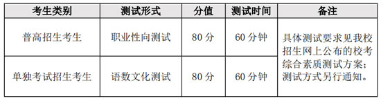 ??季C合素質測試實行分類命題、分類評價。各專業普高招生考生進行職業性向測試,重點考核職業適應性;單獨考試招生考生進行語數文化測試,重點考核文化素質。測試成績四舍五入保留兩位小數。具體測試規則如下: