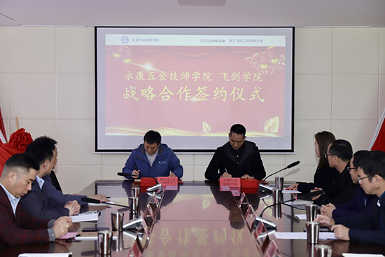 出席本次簽約儀式的有永康五金技師學(xué)院黨委委員、副院長(zhǎng)吳勇,招生就業(yè)處副處長(zhǎng)呂華福,胡天喜博士帶領(lǐng)的科研團(tuán)隊(duì),技能鑒定中心副主任黃挺;以及飛劍工貿(mào)的董事長(zhǎng)夏飛劍、副總裁錢(qián)寶、常務(wù)副總王志杰、經(jīng)營(yíng)管理部主管王康付、董事長(zhǎng)助理公共關(guān)系部長(zhǎng)徐亮和相關(guān)技術(shù)部門(mén)代表。