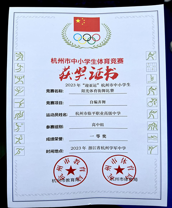 近日,“迎亞運”杭州市中小學陽光體育街舞比賽在杭州市學軍中學舉行,全市普高與職高二十多支隊伍同場競技的激烈賽況下,臨平職業高級中學街舞隊員們充分展現了自己的才華和技能,在比賽中脫穎而出,榮獲一等獎!