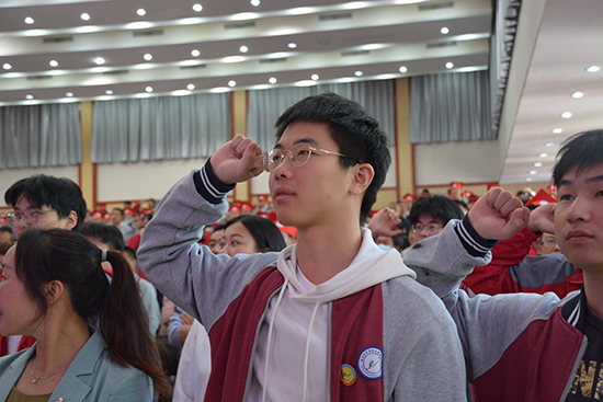 在李鵬鵬同學(xué)的帶領(lǐng)下,全體學(xué)生莊嚴(yán)宣誓。徐晉謙校長(zhǎng)為各班授戰(zhàn)旗。誓言錚錚,戰(zhàn)旗獵獵,同學(xué)們接過的不僅是一份信任和重托,更是一份責(zé)任和擔(dān)當(dāng)!