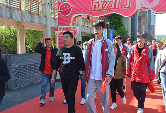 踏上紅地毯,走過成人門,在簽名墻前留下自己的簽名,高三學(xué)子攜手最親愛的家人來到大報(bào)告廳內(nèi)。在莊嚴(yán)的國(guó)歌聲中,高三年級(jí)成人儀式暨高職考倒計(jì)時(shí)30天宣誓儀式正式拉開序幕。