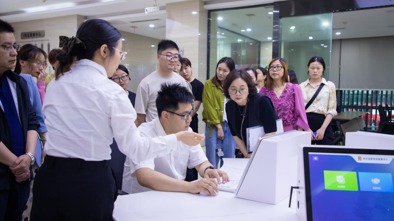 長(zhǎng)興人民法院司法普惠中心工作人員向大家介紹了司法普惠中心的發(fā)展歷程,并帶領(lǐng)參觀了訴訟指引區(qū)、在線協(xié)同區(qū)、在線訴訟區(qū)、法治體驗(yàn)區(qū)、惠民服務(wù)區(qū)和綜合指揮室“五區(qū)一室”。特別是人機(jī)交互的導(dǎo)訴模式、“自助畫(huà)像交互終端機(jī)器”引起了大家的關(guān)注,大家紛紛參與體驗(yàn),一行人還參觀調(diào)解長(zhǎng)廊,觀看各類典型案例;并走入審判庭,感受了法庭的莊嚴(yán)和神圣。