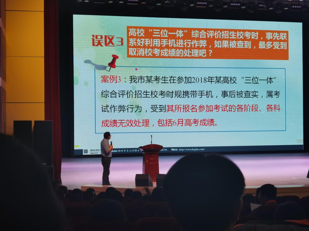 教務(wù)處朱小平老師從真實(shí)的誠信故事展開宣講,論述誠信對(duì)于個(gè)人成長的重要意義。他結(jié)合多年考務(wù)工作實(shí)際,突出介紹考試中經(jīng)常出現(xiàn)失誤,進(jìn)而可能影響誠信考試問題的案例,比如:帶入有存儲(chǔ)功能的電子設(shè)備、提前答題等。同時(shí),他重點(diǎn)強(qiáng)調(diào):今年突出的變化是手機(jī)等電子設(shè)備的二次安檢,辨析了違規(guī)、違紀(jì)等概念,再認(rèn)知了這些行為可能會(huì)承擔(dān)的嚴(yán)重后果等。