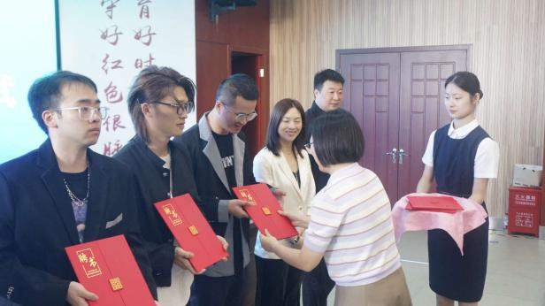 傳承創新,成才有路。在熱烈的掌聲中,由區教育研究學院教研員馮國民老師為繪夢班授班旗,并由企業實踐導師徐能康給每個創業團隊授團隊旗。