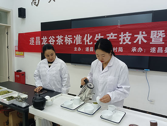 培訓班聘請專家開展龍谷茶(扁形)標準化生產指導,并帶領學員到浙江農業商貿職業學院茶業學院進行評茶技能學習。