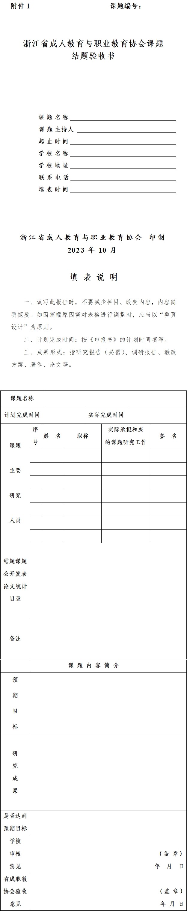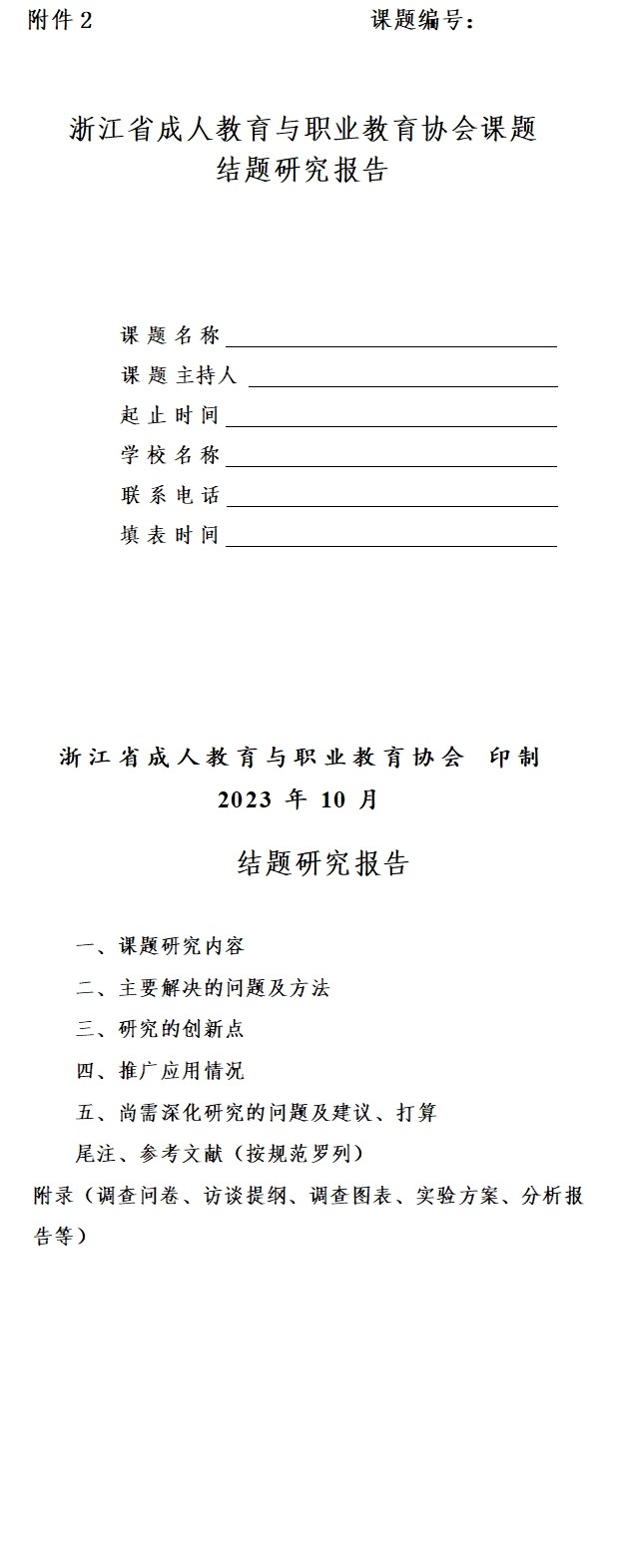 1.請(qǐng)各立項(xiàng)課題主持人準(zhǔn)備好《結(jié)題驗(yàn)收書(shū)》、《結(jié)題研究報(bào)告》和學(xué)術(shù)期刊發(fā)表材料(封面、封底、目錄、正文),加蓋公章后將電子版(word版和PDF版各一份)發(fā)至指定郵箱。高職院校課題發(fā)送至各高職院校;中職學(xué)校、成人文化技術(shù)學(xué)校(社區(qū)學(xué)校)、普通高校繼續(xù)教育學(xué)院以學(xué)校為單位統(tǒng)一報(bào)送至協(xié)會(huì)秘書(shū)處郵箱。材料報(bào)送時(shí)間:11月1日-11月17日。