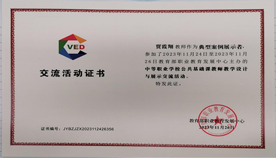 11月26日,2023年全國中等職業學校公共基礎課教師教學設計與展示交流活動在南京落下帷幕,溫州市龍灣區職業技術學校賈霞翔老師表現優異,獲得評委一致好評,其參賽作品入選全國中等職業學校公共基礎課教師教學設計典型示范案例,將由高教社出版,全國推廣。