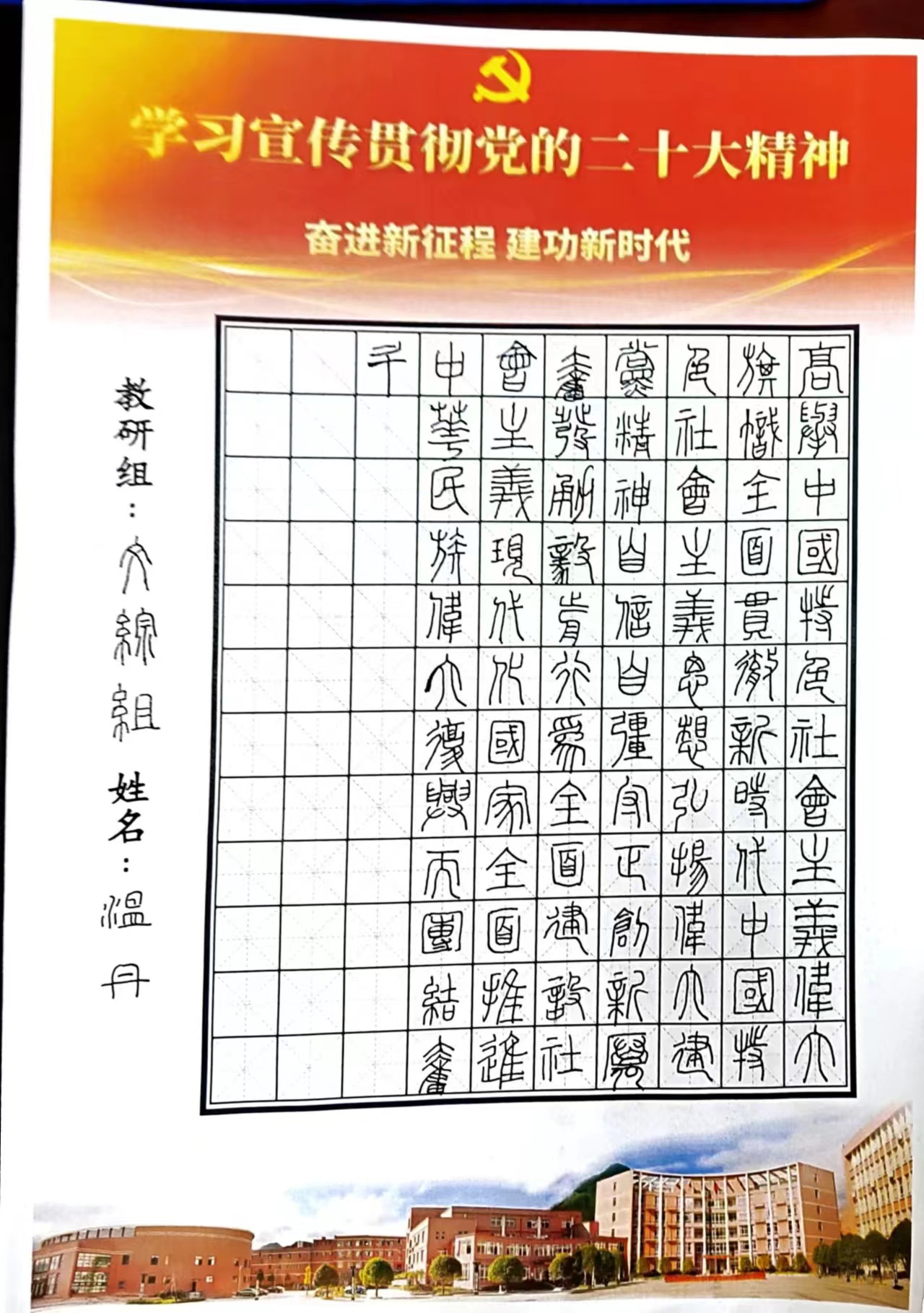 最是書香能致遠(yuǎn),筆墨丹香展英姿。為學(xué)習(xí)宣傳貫徹黨的二十大精神,增強(qiáng)教師群體厚植愛黨、愛國、愛社會主義的情感,也為促進(jìn)教師夯實教學(xué)基本功,提升書寫水平,培養(yǎng)規(guī)范書寫的習(xí)慣,11月下旬,慶元縣職業(yè)高級中學(xué)組織全校教師開展硬筆書法大賽,此次大賽,由學(xué)校統(tǒng)一命題,書寫內(nèi)容為黨的二十大主題。