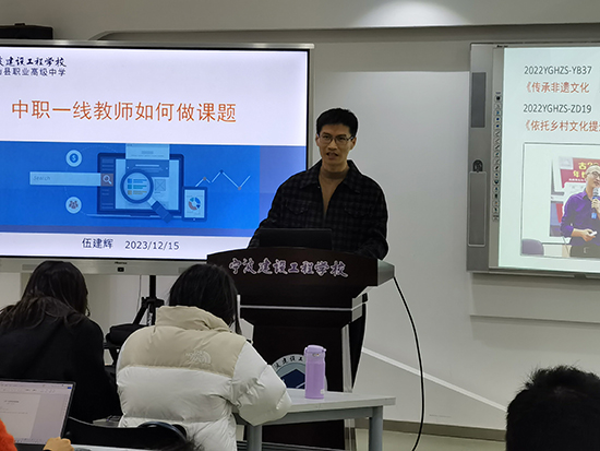 課題研究是提高教師專業素養,提升學校教育教學質量的有效途徑。為加強年輕老師們的課題研究意識,提高課題研究水平,促進學校教育科研的發展,12月15日下午,寧波建設工程學校開展了青年教師沙龍活動之“中職一線教師如何做課題”,特邀請學校英語教研組長、寧波市教育科研先進個人伍建輝老師為大家傳經送寶。