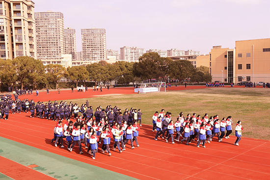 頂著寒風(fēng),四名校田徑隊員守護著校旗,步調(diào)一致地跑在跑道中央,全校79個班級組成的79個方陣由班主任帶隊一起慢跑前進,體育分管校長則領(lǐng)跑在前。因為班級數(shù)量較多,全校各班分成田徑場、籃球場、行政樓大花壇周邊三個區(qū)域同時展開跑步,跑步的距離是1200米。幾圈跑下來,同學(xué)們感到渾身暖和,倍感舒適,個別同學(xué)雖然氣喘吁吁、累得幾度想放棄,但還是在老師的鼓勵下堅持跑完全程。
