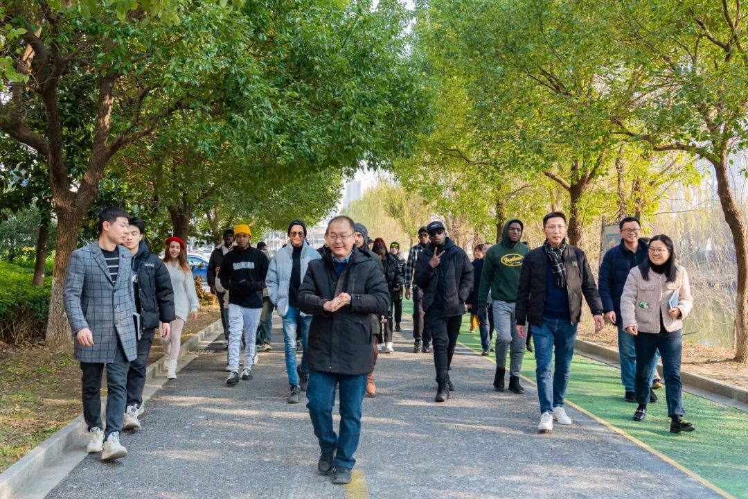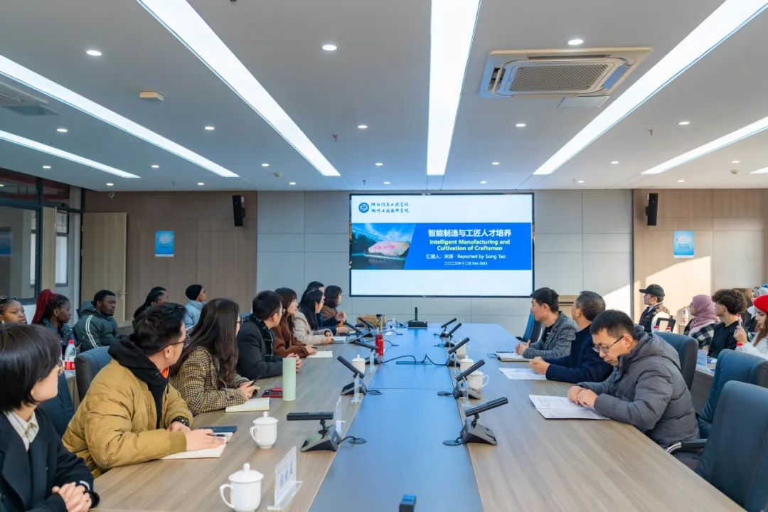 正值“一帶一路”倡議提出十周年之際,為搭建和諧互鑒、美美與共的文化交流平臺,并為扎實推進“一帶一路”教育行動走深走實,加快學校“雙高”建設,拓寬留學生對職業(yè)教育的認知,12月27日下午,湖州師范學院工學院的近30名來自尼日利亞、摩洛哥、津巴布韋、博茨瓦納、孟加拉國、幾內亞、加納、烏茲別克斯坦等“一帶一路”沿線國家留學生團隊在院長唐培松、副院長周哲的帶領下,來到浙江信息工程學校·湖州工程技師學院進行交流活動。校黨委書記、校長崔燕榮,副校長陸婷等人熱情接待并陪同。