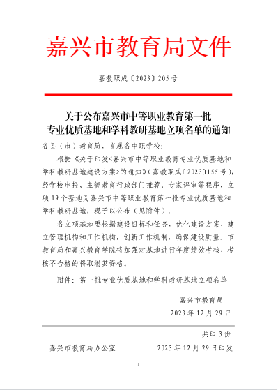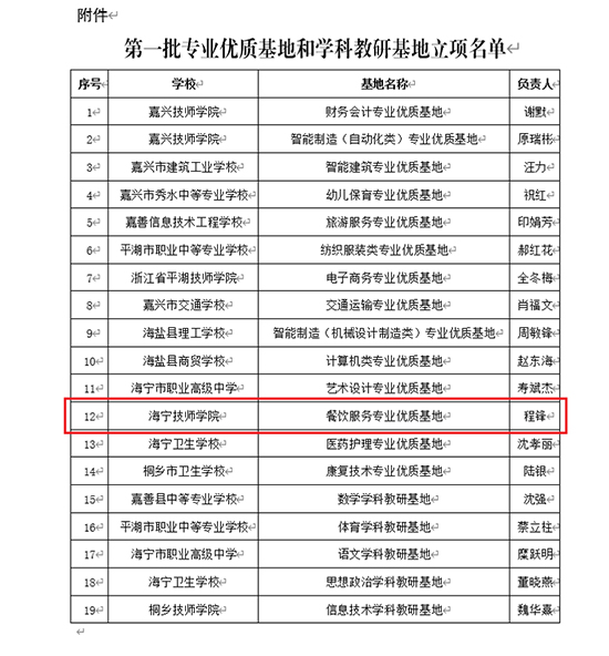 舊朝歲月隨風(fēng)逝,新載希望翹首來。2023年12月末,根據(jù)嘉興教育局文件嘉教職成〔2023〕205號《關(guān)于公布嘉興市中等職業(yè)教育第一批專業(yè)優(yōu)質(zhì)基地和學(xué)科教研基地立項(xiàng)名單的通知》,海寧技師學(xué)院烹飪專業(yè)立項(xiàng)嘉興市中職學(xué)校第一批“專業(yè)優(yōu)質(zhì)基地”,不僅成為學(xué)院唯一一個(gè)立項(xiàng)“專業(yè)優(yōu)質(zhì)基地”的專業(yè),也是嘉興市中職學(xué)校烹飪專業(yè)中唯一一個(gè)立項(xiàng)的學(xué)校。