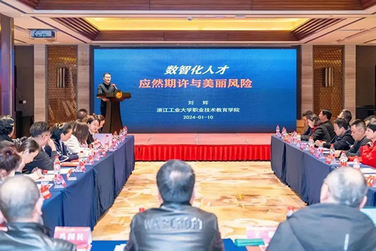 浙江工業大學職教學院高教所所長劉輝作《數字化人才:應然期許與美麗風險》主題講座。他圍繞三個“一”:適應“一”個新社會形態,服務“一”種新經濟形態,支撐“一”個新智群體以及兩個資源中心,三類代碼開發,四種專業架構,五類實訓項目,帶我們走進人工智能,開啟一條數字化賦能專業發展之路。
