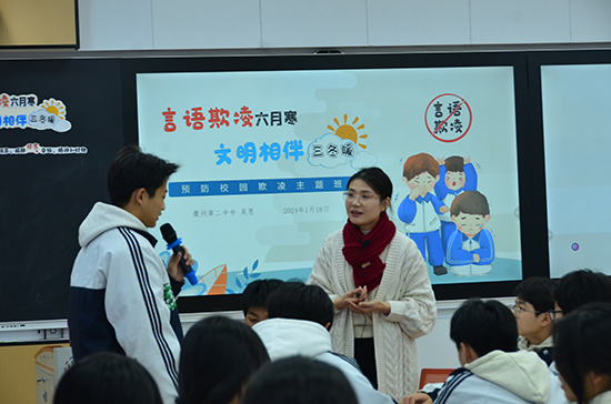 在18日上午的班會(huì)課展示環(huán)節(jié),衢州第二中專的吳思老師以“言語(yǔ)欺凌風(fēng)寒,文明相伴三冬暖”為主題,引導(dǎo)學(xué)生認(rèn)識(shí)到文明用語(yǔ)的重要性。衢州工商學(xué)校的李爾老師展示了題為“低碳生活,從一度電開始”的班會(huì)課,引導(dǎo)學(xué)生實(shí)踐節(jié)能減排。
