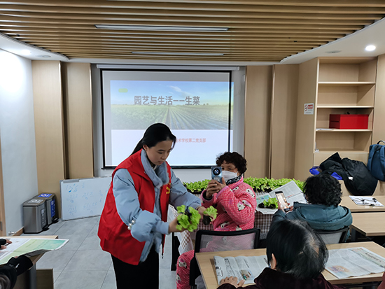 1月22日,湖州農校黨總支第一黨支部的楊勇老師、第二黨支部的徐婷婷老師來到湖州市星匯半島社區幸福鄰里中心,為社區居民開展《生菜栽培》的公益培訓活動。楊老師從生菜的生長習性、種苗繁育、生產應用、家庭園藝四個方面進行闡述,結合種苗盆栽,一一解答學員提出的日常實際問題,并傳授了一些種植小竅門。生菜諧音“生財”,楊老師和徐老師將湖州農?;嘏嘤纳朔N苗贈送給居民學員,祝福學員“新年生財”。
