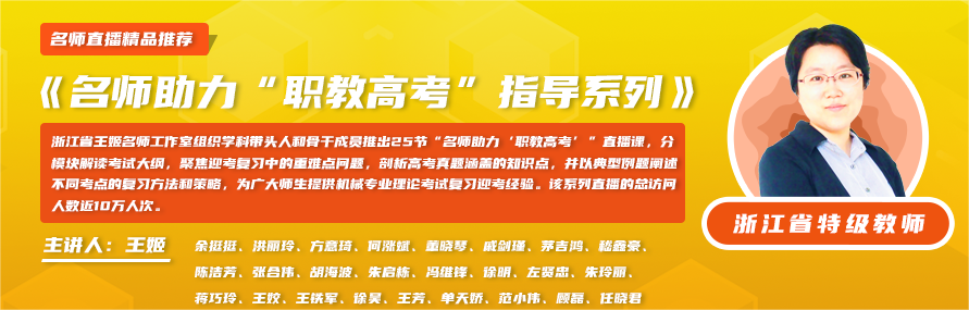 浙江省王姬名師工作室組織學科帶頭人和骨干成員推出25節“名師助力‘職教高考’”直播課,分模塊解讀考試大綱,聚焦迎考復習中的重難點問題,剖析高考真題涵蓋的知識點,并以典型例題闡述不同考點的復習方法和策略,為廣大師生提供機械專業理論考試復習迎考經驗。該系列直播的總訪問人數近10萬人次。