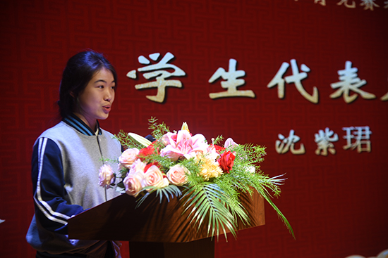 沈紫珺同學(xué)發(fā)言,他講述了自己的備賽經(jīng)歷,分享了自己對(duì)輸贏的感悟和體會(huì),并感謝學(xué)校、體育組和教練對(duì)自己的培養(yǎng),表示將珍惜機(jī)會(huì)、努力訓(xùn)練、為校爭(zhēng)光。