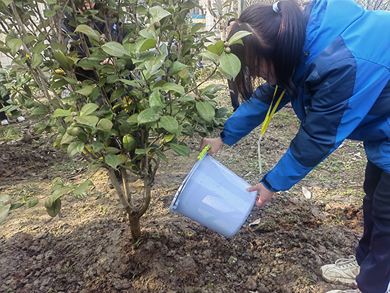 在園林專業老師的指導幫助下,同學們三人一組、五人一簇,“除草、挖土、固定、培土、澆水……”植樹現場一片熱火朝天的景象,處處洋溢著團結協作、奮發向上的青春氣息。