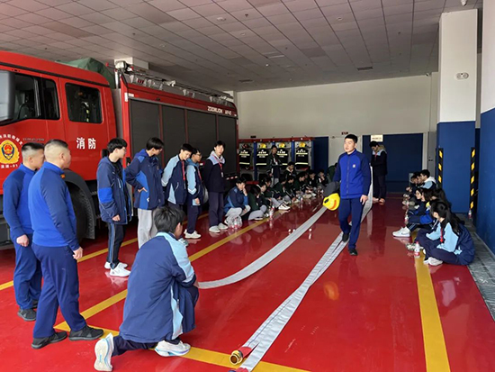 3月12日下午,學生處副處長王宇昕、學生處周嘉俊老師、宿管總教官禹亞雄帶隊攜平安校園服務隊三十余名學生干部走進湖州市濱湖消防救援站,零距離感受消防戰士訓練日常,面對面學習消防安全常識和消防應急處置技能。