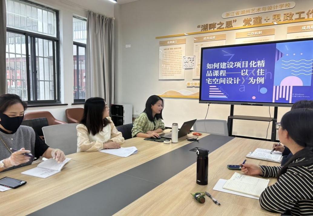 工藝美術教研組學科帶頭人教師、市教學能手費曉旦老師圍繞《如何建設項目化精品課程——以住宅空間設計為例》主題,從精品課程建設理念、教材建設、教學方法創新、教學資源建設及學生評價體系等五個方面,闡述了其精品課程建設的特色做法和項目成效。
