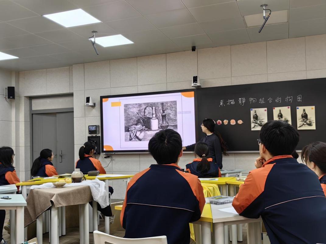 基礎美術教研組組長、市直教壇新秀金琳琳執教的《靜物素描組合的構圖》公開研討課既注重師生的有效互動,更突顯技能課程的學練結合。該課設計流程清晰,教學主線突出。她以莫蘭迪的靜物構圖手稿導入新課,彰顯嚴謹構圖的意義。再從構圖的基本原則入手,詳細講解靜物素描組合中的五種常見構圖形式。在實例演示環節,金老師通過高清直播展示臺用嫻熟的筆觸描繪了一組靜物的小構圖,并深入剖析了它在構圖上的特點和技巧。這既充分展示了專業教師的扎實基本功,更加體現了教師數字素養理念的落地。