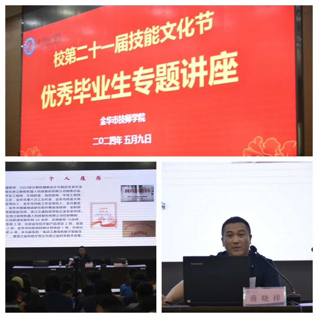 中國裝飾協會高級室內設計師、金華市裝飾裝修協會設計研發中心成員,學校2017屆室內設計專業畢業生冉秋菊與浙江碩和機器人科技股份有限公司銷售總監、前端開發工程師、車間政委,學校2009屆計算機輔助設計與制造專業畢業生盛曉祥。兩位優秀畢業生回校為學弟學妹們開設講座。他們分享了自己的在校就讀經歷、職業成長生涯、技能奮進路上的感悟,真摯的話語,精彩的講座,令學子們沉浸其中,收益良多。