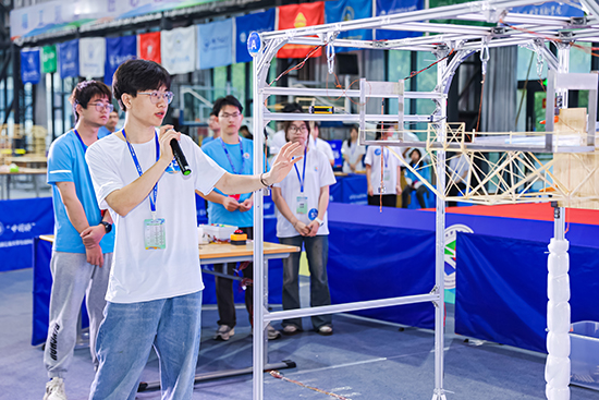 本屆大賽以“懸挑觀景平臺(tái)結(jié)構(gòu)設(shè)計(jì)與模型制作”為選題,包含理論方案、模型制作、陳述與答辯、加載試驗(yàn)等環(huán)節(jié)。參賽選手們制作的模型由不超過105根竹材制作而成,竹材厚度1毫米、寬度2—6毫米和長度不超過900毫米,整體約重100—300克,能承受模型自重的50倍荷載。大賽用三個(gè)鋼球來模擬人群荷載,在4分鐘的加載時(shí)間內(nèi),當(dāng)模型出現(xiàn)結(jié)構(gòu)整體垮塌,或模型發(fā)生位移、測試報(bào)警器響起,或加載過程中任意小鋼球滾出觀景平臺(tái)道板,均視為模型加載失敗,加載過程驚險(xiǎn)又刺激。