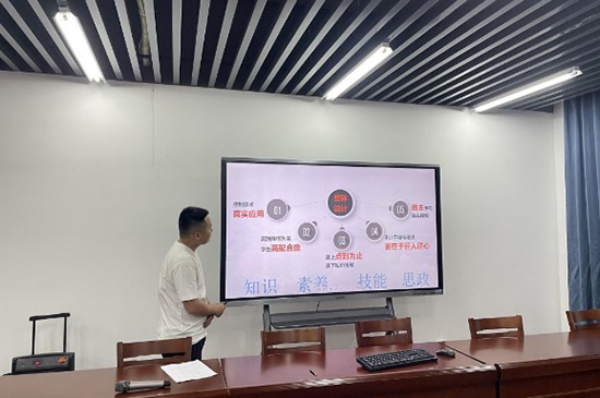學校9位青年教師分成專業課組與文化課組依次上臺進行說課展示。老師們圍繞教學內容,從設計意圖、教學目標、教學重點難點、教學方法、教學流程、板書設計以及教學特色等方面進行了全面的闡述。