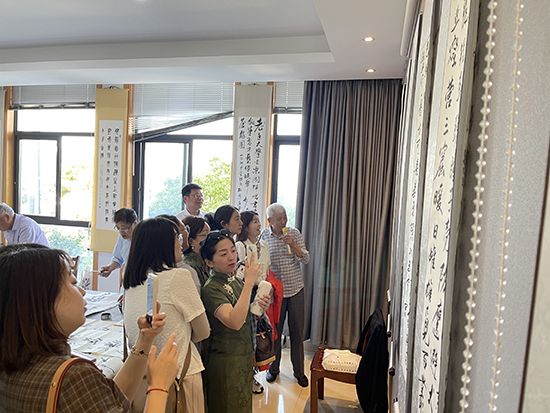 “屬雞的詩在哪里?”“有屬猴的詩嗎?”考察團(tuán)成員在書法創(chuàng)作室被“左筆書法大師”顧關(guān)心老師的書法作品吸引,紛紛用手機(jī)拍照留存。