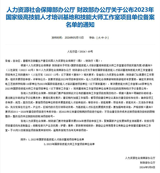 5月13日,人力資源和社會保障部辦公廳、財政部辦公廳聯合發文,公布了2023年國家級高技能人才培訓基地項目建設單位名單。浙江省僅有3家單位入選,其中永康五金技師學院獲批生產制造類A檔,成為金華市唯一上榜單位。