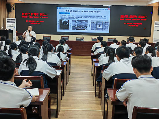 “我認為新質生產力是一種非常先進、高效、高質量的生產方式。”“在我看來,新質生產力就是那些能推動我們社會快速發展,讓我們的生活變得更加方便、高效的新技術和新方法。”5月29日晚,衢州第二中等專業學校崇業樓報告廳內,一場校長與學子之間關于新質生產力的深度交流正在精彩地上演著,學校黨委書記、校長徐凌志給全體團員帶來一堂別開生面的思政課,與同學們一起開啟了一段“新時代·新青年·新動力”為主題的新質生產力探索之旅。