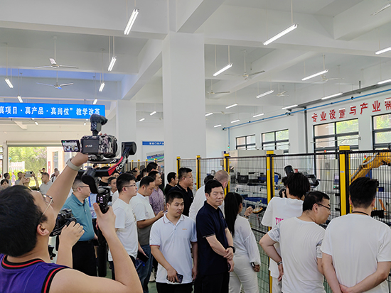 會(huì)前,與會(huì)人員走進(jìn)永康五金技師學(xué)院產(chǎn)教融合大樓的實(shí)訓(xùn)車(chē)間。在學(xué)校黨委委員胡贊介紹下,眾人參觀了學(xué)校與科普未的校企合作成果“通軸門(mén)智能化無(wú)人產(chǎn)線”,了解到學(xué)校正在探索的“1條真實(shí)自動(dòng)化生產(chǎn)線+1個(gè)虛擬仿真中心+N個(gè)一體化學(xué)習(xí)工作站”的1+1+N產(chǎn)教融合模式。