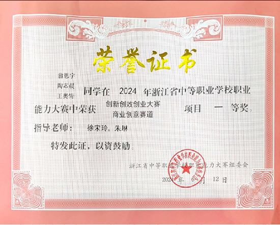 6月11日至12日,2024年浙江省中等職業學校職業能力大賽(學生職業素養類)“創新 創效 創業”賽項決賽在奉化工貿旅游學校舉行。海鹽縣理工學校翁思宇、陶芯晨、王奧情代表隊在150支參賽隊中脫穎而出,憑借作品《舌尖上的非遺——“村禮”尺糕》斬獲“商業創意賽道”一等獎(第3名),指導教師徐宋玲、朱琳。