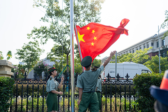 首先,舉行升旗儀式。校國旗隊邁著整齊有力的步伐,從新生方陣前走過。在雄壯的國歌聲中,國旗冉冉升起。