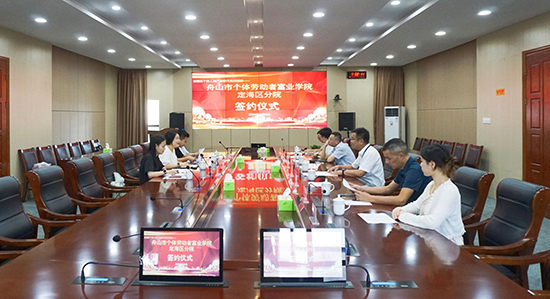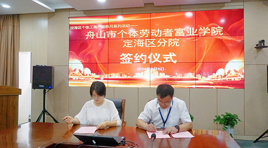 儀式上,舟山市市場監督管理局定海分局、舟山職業技術學校(舟山技師學院)、舟山市定海區個體勞動者協會三方代表共同簽署了戰略合作協議,正式宣布了富業學院定海區分院的成立。