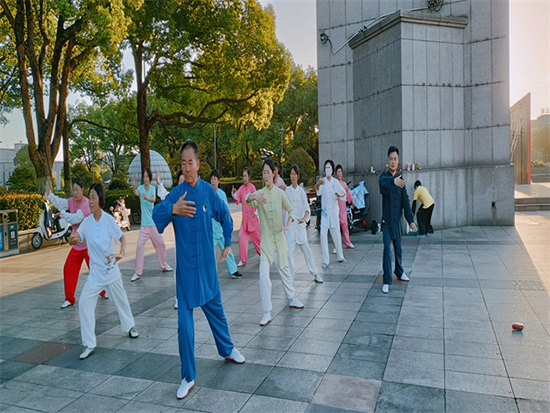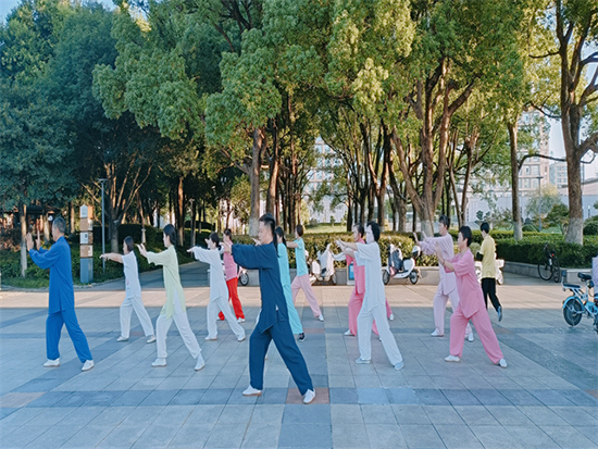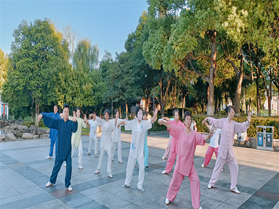 學(xué)員們?yōu)t灑飄逸、開合有序、輕柔舒緩、張弛有度的動(dòng)作,盡顯太極拳愛好者熱愛生活、健康向上的精神面貌。