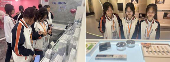 在講解員的帶領下,大家參觀了美妝文化展示館,集中展示了美妝歷史文化發展,集聚國內外多家優秀化妝品企業發展歷程、文化與產品,同時也詳細了解了美妝小鎮的發展歷程。隨后,一行人走進美妝技能演示區。這里是美妝與服飾的集結地,展現了時代的流變和文化的交融,古與今、東與西的美學在這里融合,同學們認真觀摩、驚喜贊嘆,不時用手機拍照記錄。