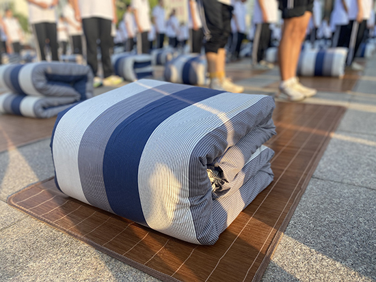 隨著裁判的一聲哨響,同學(xué)們迅速行動(dòng)起來(lái),他們手中的被子仿佛變成了待雕琢的藝術(shù)品。不同于往常匆忙整理床鋪的場(chǎng)景,此刻的每一個(gè)動(dòng)作都顯得那么專注而細(xì)致。學(xué)生們或蹲或跪,指尖在棉被間跳躍,每一次折疊、每一次按壓,都力求精準(zhǔn)無(wú)誤,力求將被子折疊成棱角分明、平整如鏡的“豆腐塊”。教官們作為此次大賽的評(píng)委,他們穿梭于學(xué)生之間,目光如炬,不僅關(guān)注著被子的最終形態(tài),更重視學(xué)生們?cè)谡郫B過程中的態(tài)度與細(xì)節(jié)。