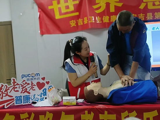 此次活動共有68名老年人參加,鄭艷醫師重點分析了老年人自救和互救中常見的方法,她從老年人跌倒、噎食、氣道異物梗阻和心肺驟停急救等現場急救的知識逐項講解,再現場演示操作,最后,學員上臺體驗心肺復蘇等現場急救過程。