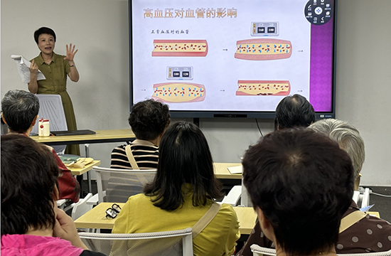 開班儀式結(jié)束后,三十多位中老年學員共同聆聽了施醫(yī)生關(guān)于《踐行健康生活方式,遠離沉默的殺手——淺談中老年高血壓病防治》專題講座。講座長達兩小時,施醫(yī)生就重視高血壓、了解高血壓、高血壓的治療和健康生活方式、如何家庭自測血壓、血壓波動時的自我管理五大方面,作了耐心細致、深入淺出的講解,深受中老年學員歡迎。