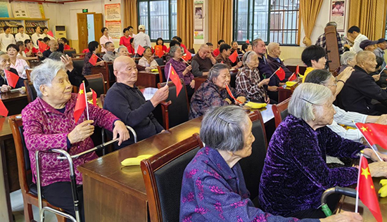 活動開始時,古林鎮老年大學太極拳班的學員們為老人們展示了老年26式楊式太極拳、觀音拳、功夫扇和木蘭扇等健身節目,并現場示范了一些簡單的伸展動作,如頸部伸展、肩部旋轉、手臂拉伸等。老人們認真跟著一起做動作,在溫暖親切的互動中,一起體驗運動的樂趣。接著,二胡班的學員們為老人們獻上了歌曲《十五的月亮》,他們的演奏技巧嫻熟,音色悠揚,讓老人們陶醉在音樂的海洋中。此外越劇班、甬劇班的學員們帶來了經典戲曲選段,他們唱腔婉轉,表演細膩。聽著熟悉的旋律,老人們興奮地一起揮舞著手中的小國旗,開心地跟著哼起了小調。
