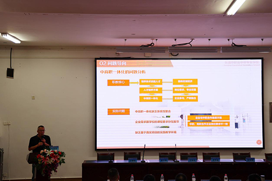 樂清市職業(yè)中等專業(yè)學(xué)校副校長吳捷凱作《“中高職產(chǎn)教融合共同體”建設(shè)的探索》主題分享。他詳細(xì)介紹了中高職產(chǎn)教融合共同體的建設(shè)情況,強(qiáng)調(diào)職業(yè)教育應(yīng)緊跟時(shí)代步伐,培養(yǎng)具備創(chuàng)新能力和職業(yè)技能的高素質(zhì)人才,以滿足社會的需求。吳副校長根據(jù)當(dāng)前問題,給出切實(shí)可行的解決方案,通過建立“一體四融合、兩院五平臺”的新模式,促進(jìn)中高職一體化發(fā)展。