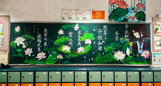 黑板報(bào)上,有的用淡雅的水墨畫描繪出荷花的高潔姿態(tài),有的以優(yōu)美的文字闡述荷文化的深刻內(nèi)涵,還有的用創(chuàng)意的排版將與荷有關(guān)的詩詞、故事巧妙融合。