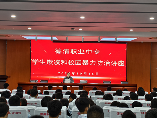 為提高學(xué)生們的法制觀念和自我保護(hù)意識,有效預(yù)防和減少校園欺凌事件的發(fā)生,10月16日下午,德清職業(yè)中專開展了“預(yù)防校園暴力 抵制校園欺凌”主題講座,學(xué)校高一年級300多名男生參加,講座由校黨委委員馬紀(jì)孝主持。