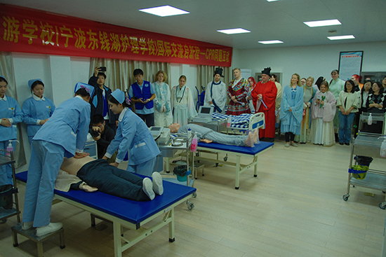 護(hù)理專業(yè)CPR同題互動、品中國茶、做中醫(yī)養(yǎng)生錘、體驗漢服文化……10月30日,來自芬蘭東南應(yīng)用科技大學(xué)健康管理專業(yè)(護(hù)理方向)20位師生走進(jìn)寧波東錢湖旅游學(xué)校。東西方面孔交匯、文化互融,為深秋的校園增色。