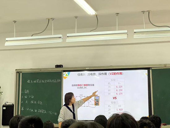 柳市職業(yè)技術(shù)學(xué)校宮亞楠老師帶來(lái)公開(kāi)課《穩(wěn)壓二極管并聯(lián)型穩(wěn)壓電源電路》,通過(guò)實(shí)驗(yàn)視頻演示穩(wěn)壓二極管在并聯(lián)型穩(wěn)壓電源電路中的工作情況,巧妙引入本課內(nèi)容,并運(yùn)用問(wèn)題引導(dǎo)學(xué)生思考仿真實(shí)驗(yàn)并記錄數(shù)據(jù)。宮老師拆解復(fù)雜問(wèn)題,學(xué)生掌握穩(wěn)壓原理后,通過(guò)游戲鞏固知識(shí),最后,總結(jié)并展示三個(gè)電路供課后討論。