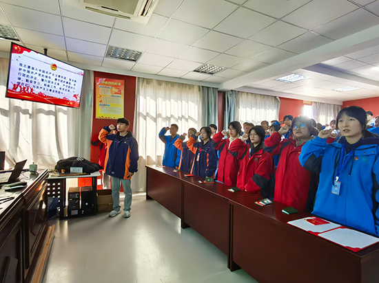 領誓人帶領新團員進行入團宣誓。全體團員緊握右拳,舉起過肩,一同在團旗下宣誓,正式加入中國共產主義青年團,踏上了奮斗新征程。