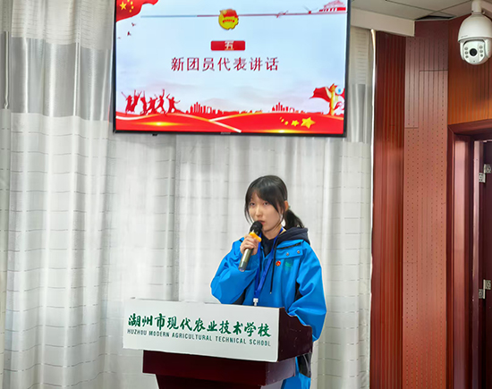 來自職普融通2401班許蕾同學作為新團員代表發言。她表示,作為新時代的青年,要牢記習近平總書記的囑托,繼承五四精神,為國家建設和民族復興的偉大事業貢獻青春力量。她的發言激勵著在場的每一位新團員,展現了青年一代的責任感和使命感。