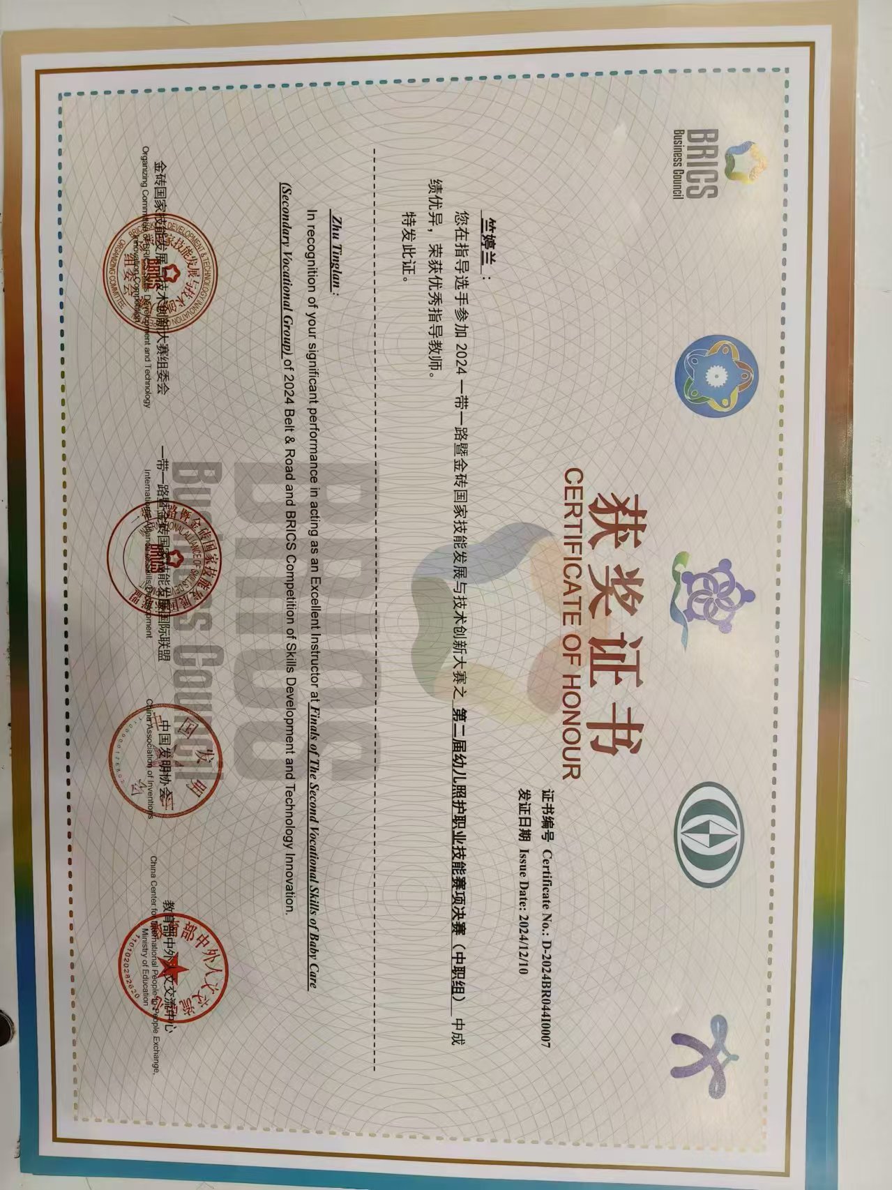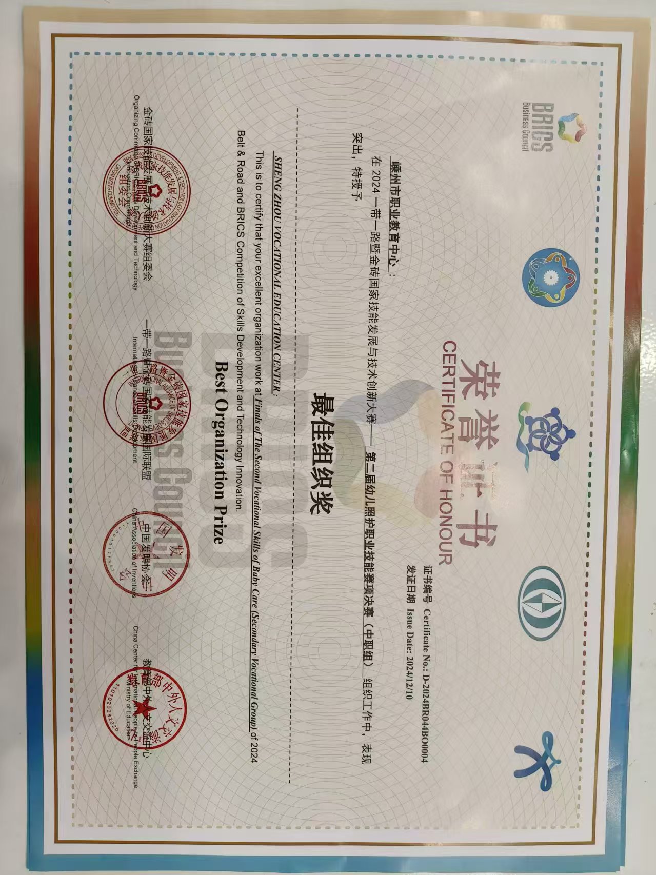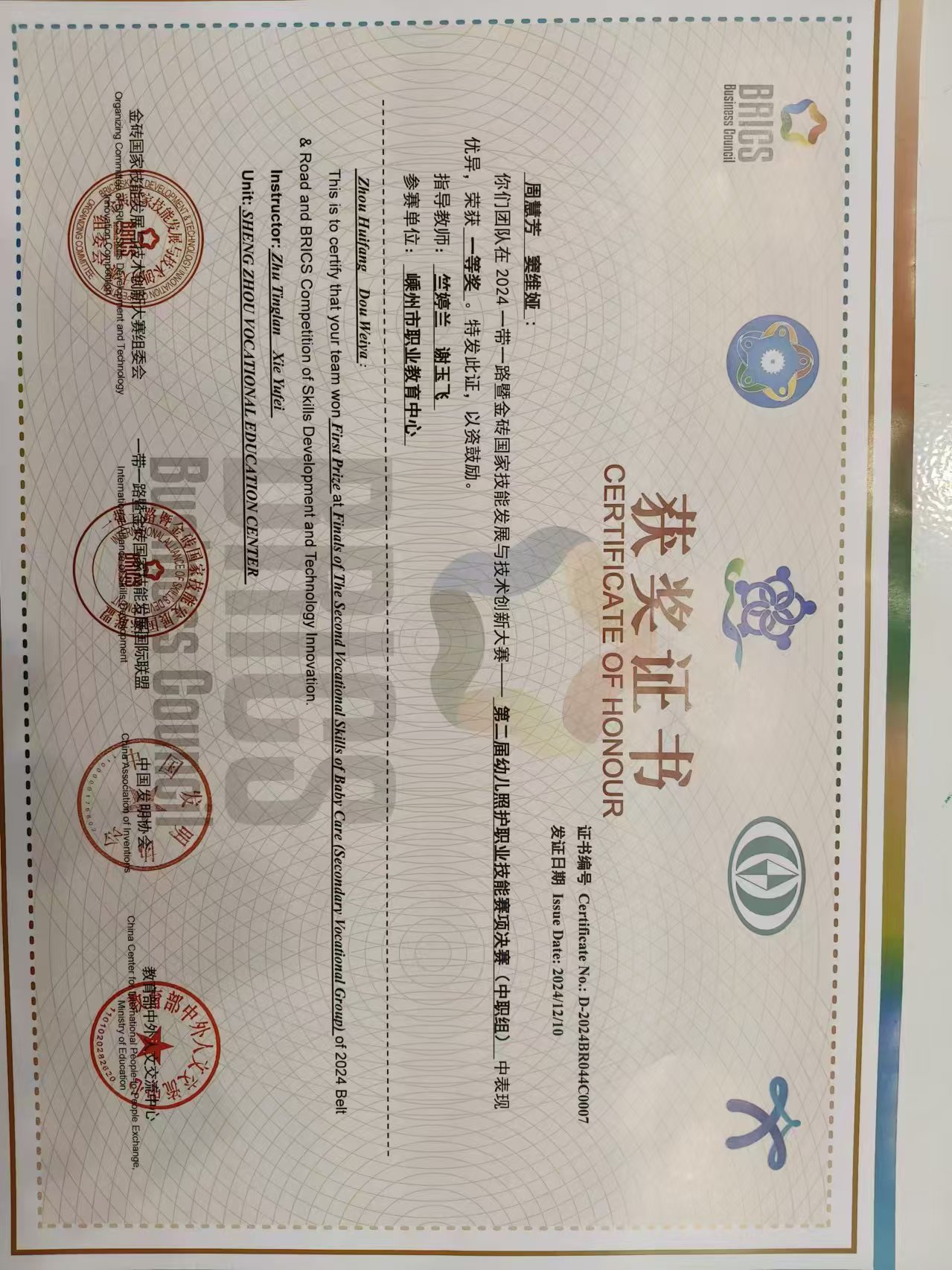 12月10日,2024年一帶一路暨金磚國家技能發展與技術創新大賽第二屆幼兒照護賽項決賽成績公布,嵊州市職教中心23保育大專班竇唯婭、周慧芳兩位同學組成的團隊成功斬獲全國一等獎,并將獲得1+X幼兒照護高級證書;竺婷蘭、謝玉飛被評為優秀指導教師;嵊州市職教中心獲“最佳組織獎”。